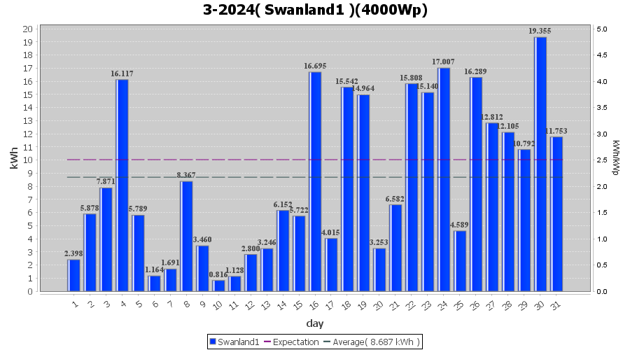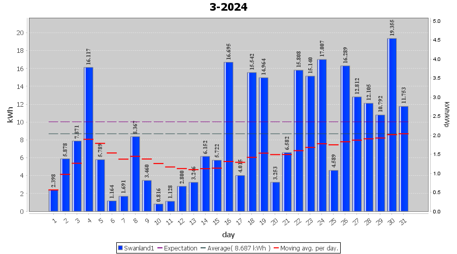 | 30-3-2024 | kWh | W/Wp | 19.355 | 4000 | 4.8 | 8.952 | £ 19.69 | 7.2 | |