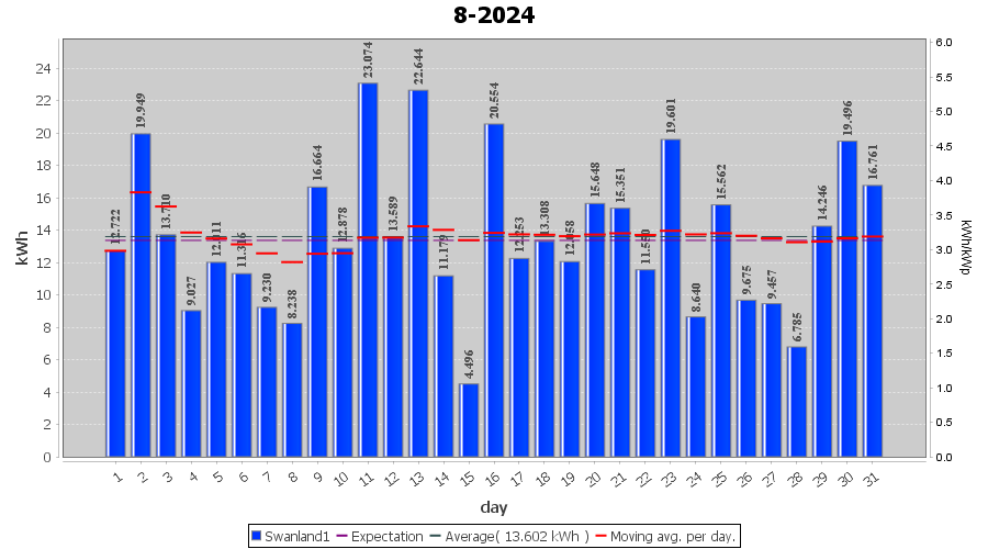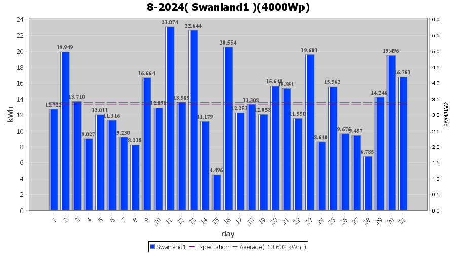 | 13-8-2024 | kWh | W/Wp | 22.644 | 4000 | 5.7 | 10.473 | £ 21.91 | 5.4 | |