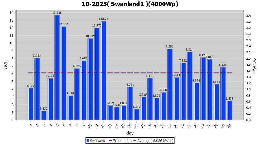 | 6-10-2025 | kWh | W/Wp | 12.132 | 4000 | 3.0 | 5.611 | £ 12.73 | 6.4 | |